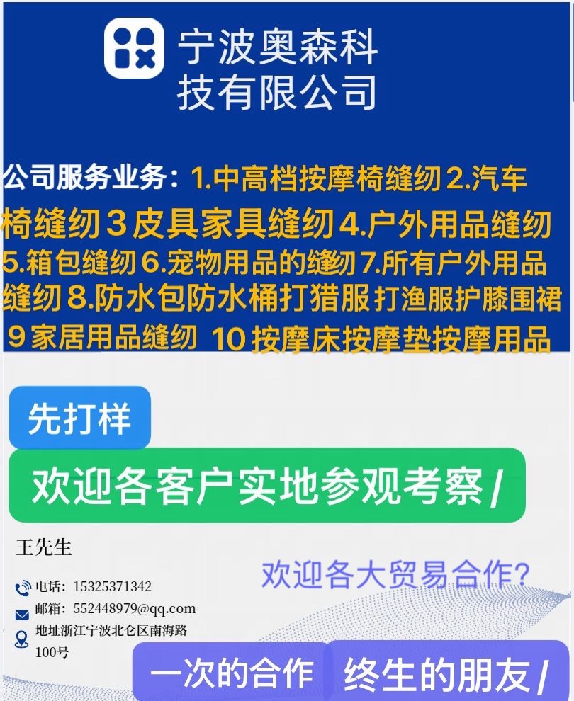 专业生产:1.高端按摩椅缝纫代工2家具家具用品:皮具沙发餐椅床,3.汽车座椅4.户外用品:防水包防水桶雨衣雨裤,帐篷,户外折叠桌椅5.宠物用品等