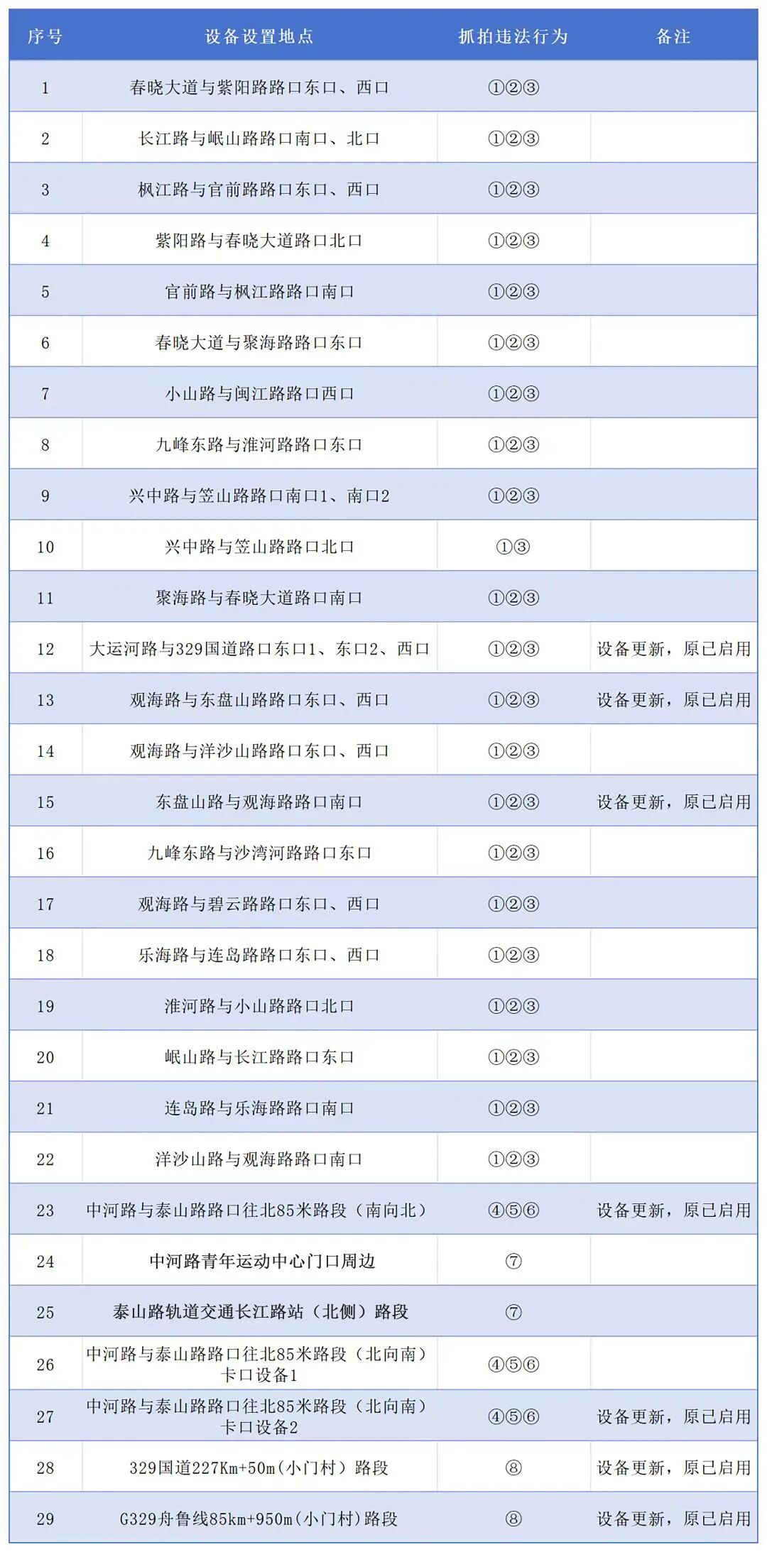 请市民们在驾驶过程中自觉遵守有关规定,有序通行。 注:以上执法设备安装地址如与之前电子警察启用公告内容表述不同的,以本次公告为准。