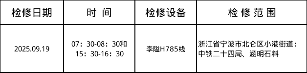 除监控设备启用 还有一条供电设备检修消息 北仑这些区域将要停电 ↓↓↓ 2025年9月15日至2025年9月21日期间,国网宁波供电公司将在北仑区部分地区对供电设备实施检修作业。 若遇雨天、雷暴等恶劣天气检修作业取消,请各相关用户谅解并做好生产安排。 小港区域(含戚家山街道峰绣云浩小区、林唐新政村、青峙工业园区等):0574-51105915柴桥区域、白峰区域、郭巨区域、大榭区域:0574-51105912(注:戚家山街道热电厂供电用户电力设备检修相关预告请咨询热电公司服务热线)
