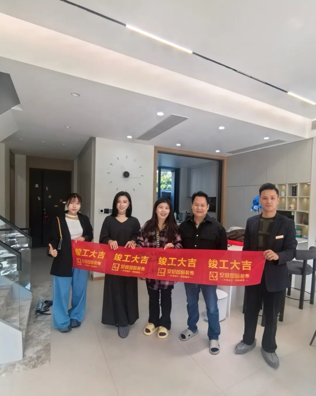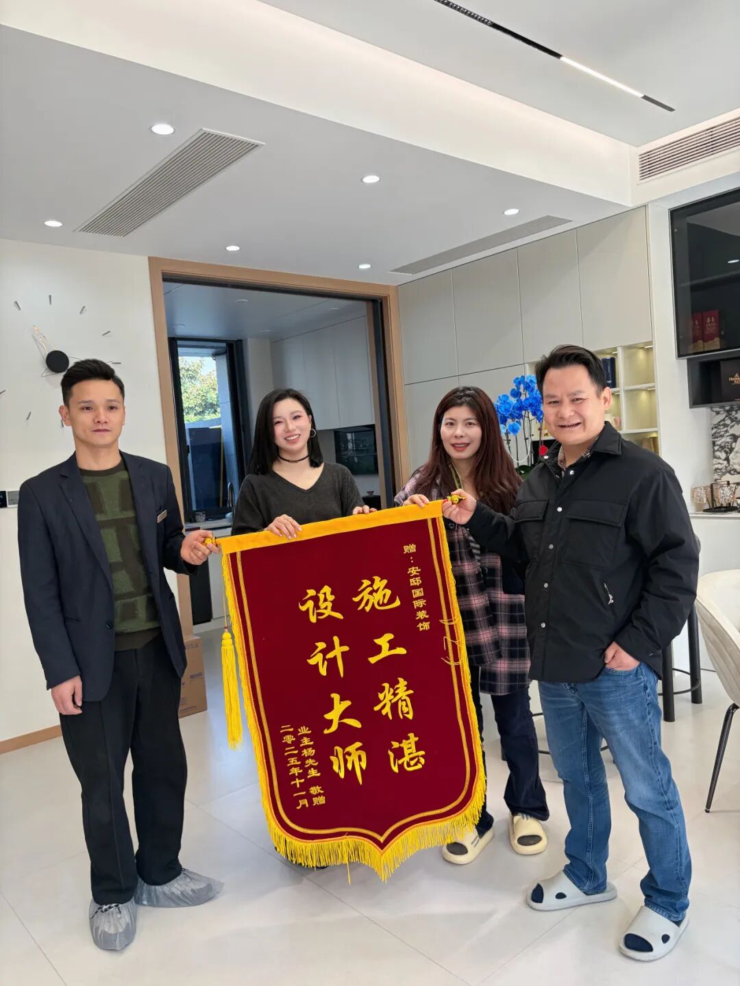 在项目竣工的合影中,一面绣着“施工精湛,设计大师”字样的锦旗格外引人注目。这不仅是对专业团队的赞誉,更是一段关于家与空间深度对话的开始。