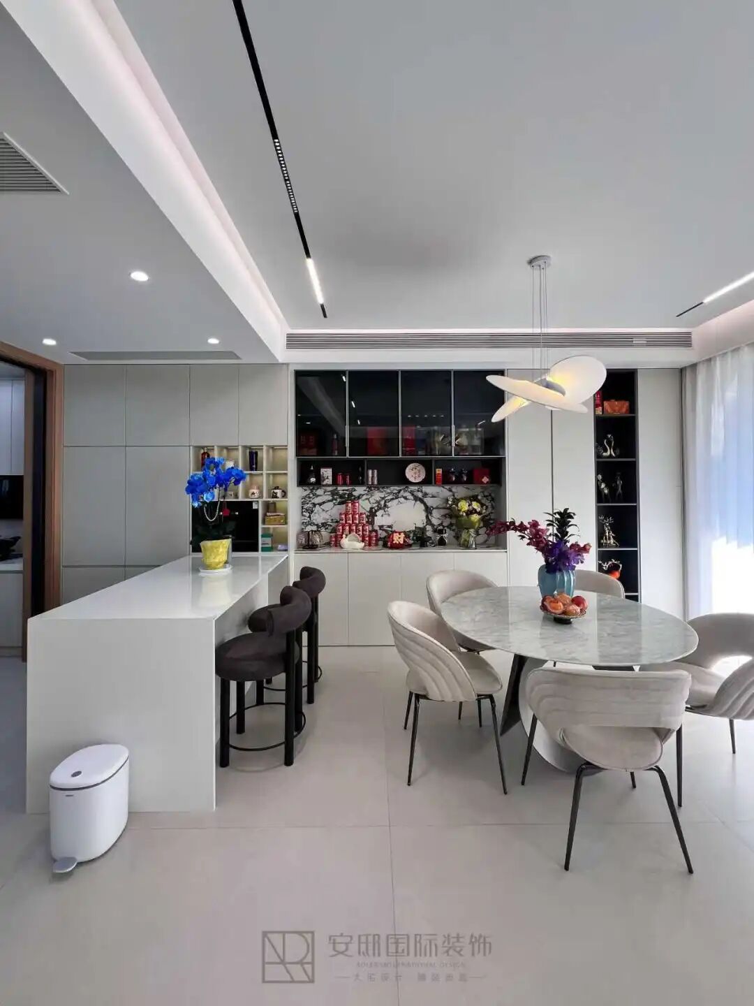 流动的社交场域 开放式布局模糊了客厅、餐厅与厨房的边界,却又通过材质变化和微妙的抬升区分功能区域。一整面落地窗将自然光引入室内,随着时间推移,光与影在空间中绘制出不断变化的画卷。 静谧的私人领域 卧室空间以低饱和度色彩为主,营造出宁静的睡眠氛围。设计师巧妙利用建筑结构,在保证私密性的同时,为每个卧室都创造了独特的景观视野。主卧套房更是将休息区、衣帽间和浴室无缝连接,形成流畅的生活动线。 美学之维 现代风格并非冷峻的代名词。在这里,天然石材的纹理、木质温润的触感、织物柔软的质感共同营造出既具当代感又不失温度的空间氛围 家的面貌从来不止一面,而在这空间里,我们看到了家的多维可能——既是私密的避风港,也是开放的社交场;既是艺术的展示空间,也是日常的生活容器;既是设计的前沿表达,也是情感的温暖归宿。