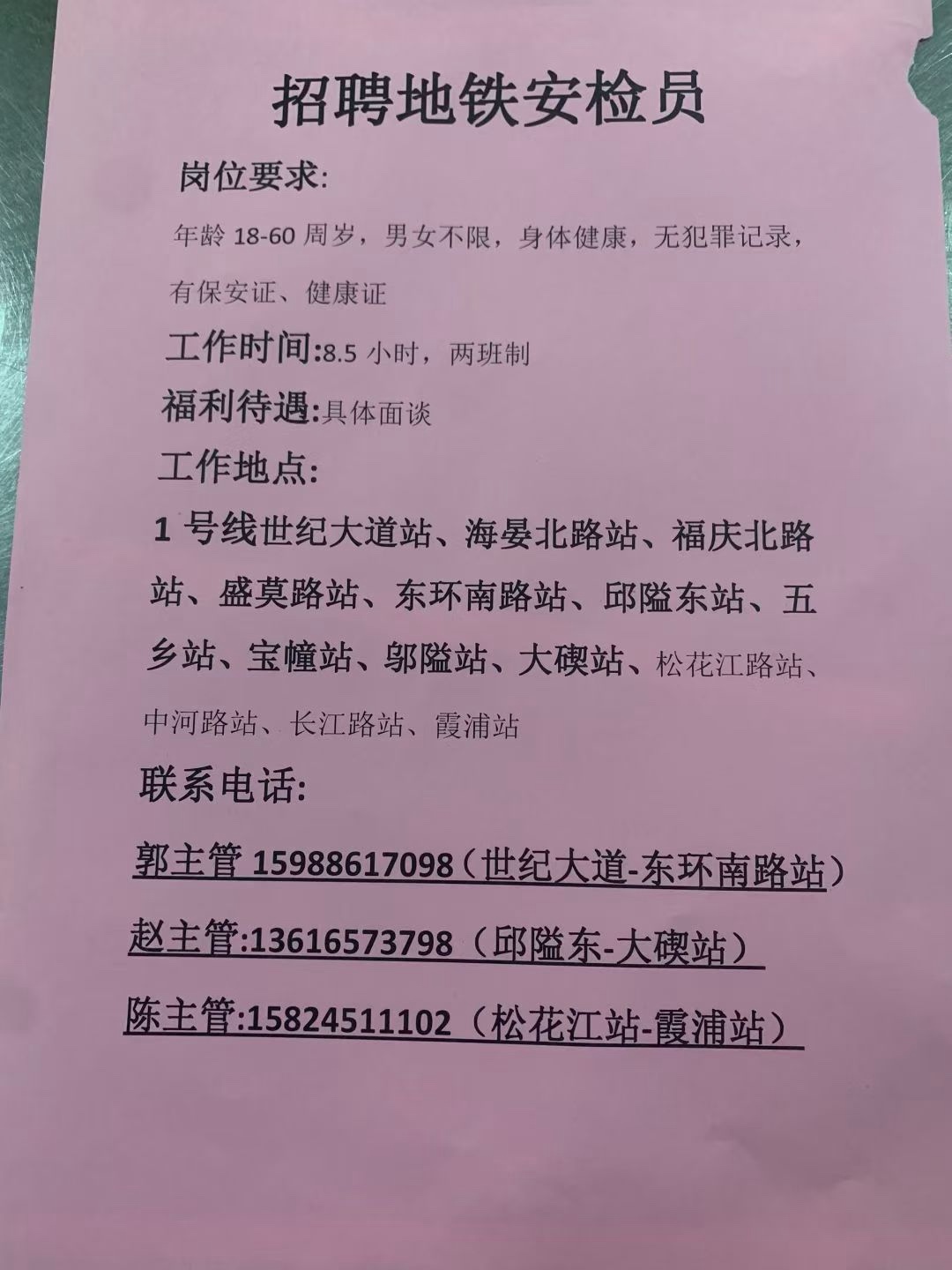 宁波地铁一号线,邱隘东,宝幢,邬隘,大碶招聘安检员,工作地点就近安排,有找工作的可致电:13616573798
